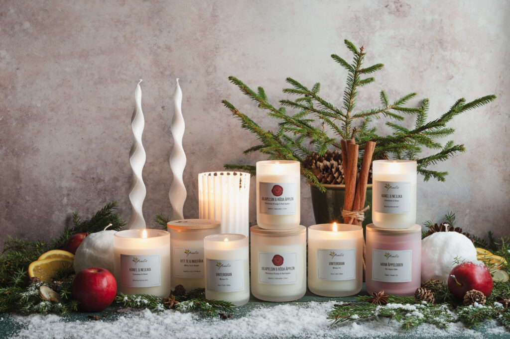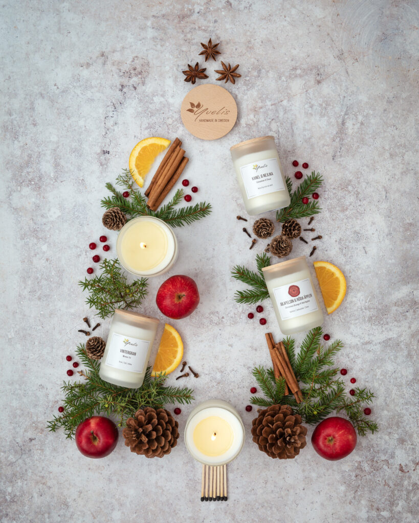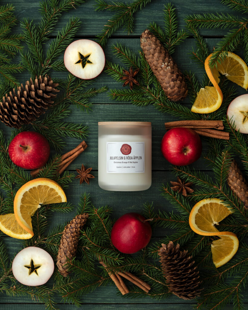 I vanlig ordning får jag fria händer från Yvonne med familj. När jag besökte verkstad och butik plockade vi produkter som doftar jul och som kunde passa in i bildserien. Deras enda rena julprodukt är egentligen bara Julapelsin & röda äpplen, men dofter som vintergran, varm äppelcider och diverse julkryddor passade utmärkt att ha med.