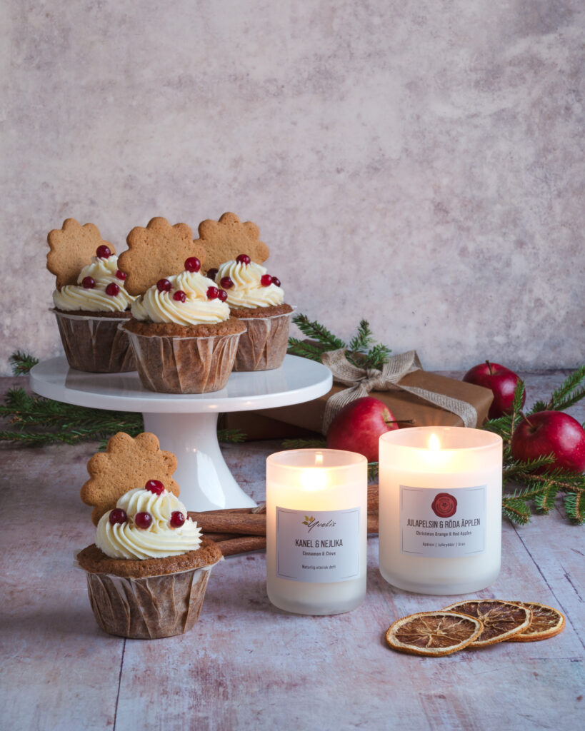 Mjuk pepparkaka är så mycket jul. Därför passade det fint att placera doftljusen i en mysig fikastund. Dessutom fick jag tillfälle att baka ett nytt recept och dela på bloggen. En win-win som man brukar säga. Här hittar du receptet på pepparkaksmuffins med färskostfrosting.